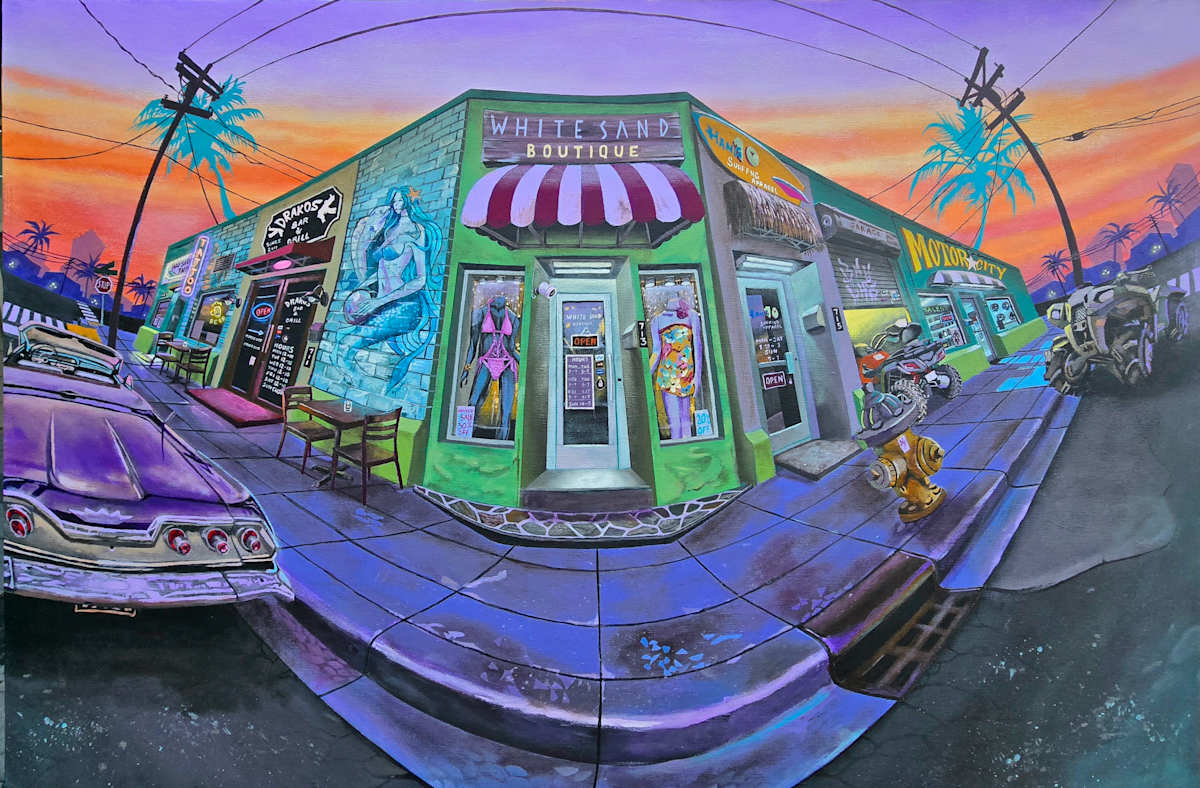 To the left of the boutique is Drako’s Bar & Grill, featuring a mermaid mural painted on a turquoise wall. The bar’s open door and sidewalk tables with drinks imply it's a lively spot.
