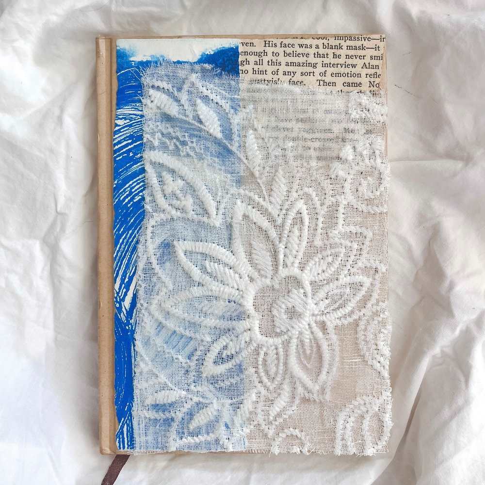 Original collage from various pieces of my own artwork are featured on this journal with blank unlined paper. This journal features a collaged art front cover ribbon bookmark and branding with signature by the artist on the back cover. Size: A5/8.3”x5.7”. 200 pages. 80gsm thick paper. Perfect for sketching writing journaling scrapbooking or anything your heart can imagine.
