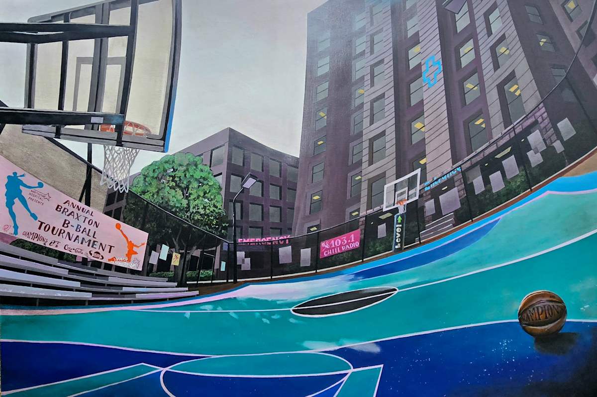 To the left, bleachers stretch beneath a banner reading “Annual Braxton B-Ball Tournament,” signaling that this is not just a local hangout but a meaningful communal hub where youth, culture, and aspiration converge. Flyers and posters cling to the fence, implying grassroots energy and local involvement. A leafy green tree in the corner breaks the urban rhythm, injecting a breath of nature into the scene.