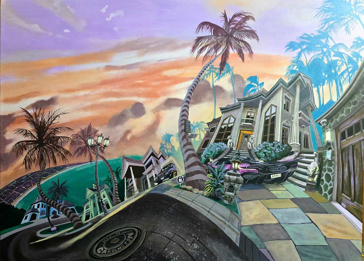 In summary, this painting doesn't just show a neighborhood—it presents a fantasy of exclusivity, with twisted visual cues that suggest both desire and unease. It’s a coastal utopia seen through a warped lens, possibly hinting at the illusions that come with chasing or maintaining wealth and status.