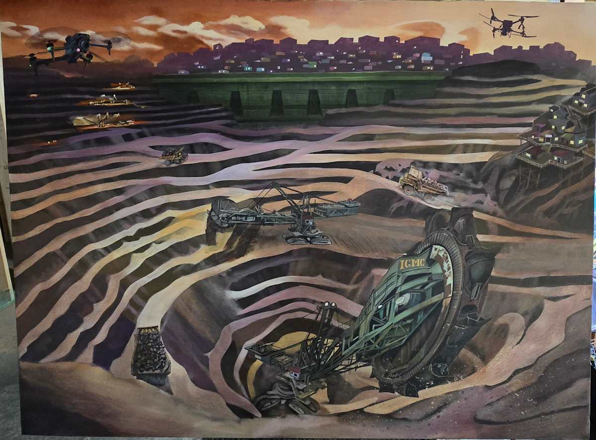 "Genesis" captures a powerful tension between human advancement and environmental cost. It portrays a world where technology dominates labor, where progress seems to require isolation, and where the scars of industry are both literal and symbolic. The painting invites viewers to reflect on the cost of resource extraction, the marginalization of nearby communities, and the surreal beauty found within industrial ruin.