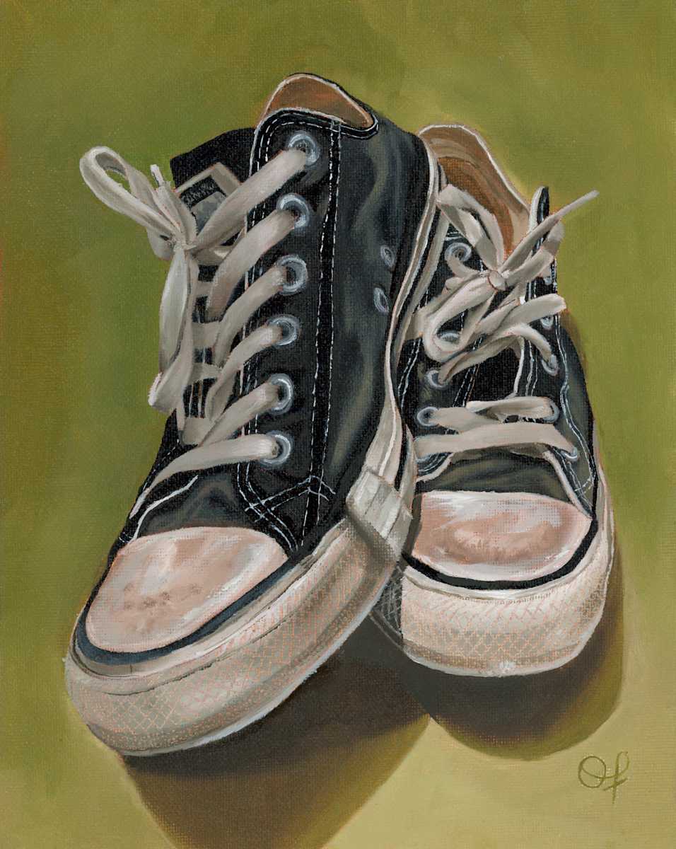 About Kate’s Shoes Kate’s black-and-white Converse Chuck Taylors are more than just a pair of sneakers—they are a connection to every chapter of her life. She first slipped into them around the 6th grade likely inspired by a Kurt Cobain image and since then they’ve become her signature. From adolescence to adulthood these shoes have been with her through it all. Kate’s fourth or fifth pair of Chucks still low-tops and classic are now a part of her identity. While she’s branched out with other shoes for comfort these sneakers still bring her back to her roots giving her the confidence she had in high school. They are a reminder of the person she’s always been and the person she continues to grow into. These shoes have carried her through more than just concerts and art shows. They’ve traveled with her across the world—from Jamaica to Bolivia Peru and Mexico—while also marking significant moments in her life. She wore them when she walked onto her college campus for the first time and when she learned she was pregnant at nineteen. A year later she bought a tiny pair for her daughter sharing the legacy of those shoes. Kate’s Chucks are with her as she continues her journey—creating art traveling and making memories with her kids and her soon-to-be husband. They remind her that each step is a part of something bigger something unforgettable.