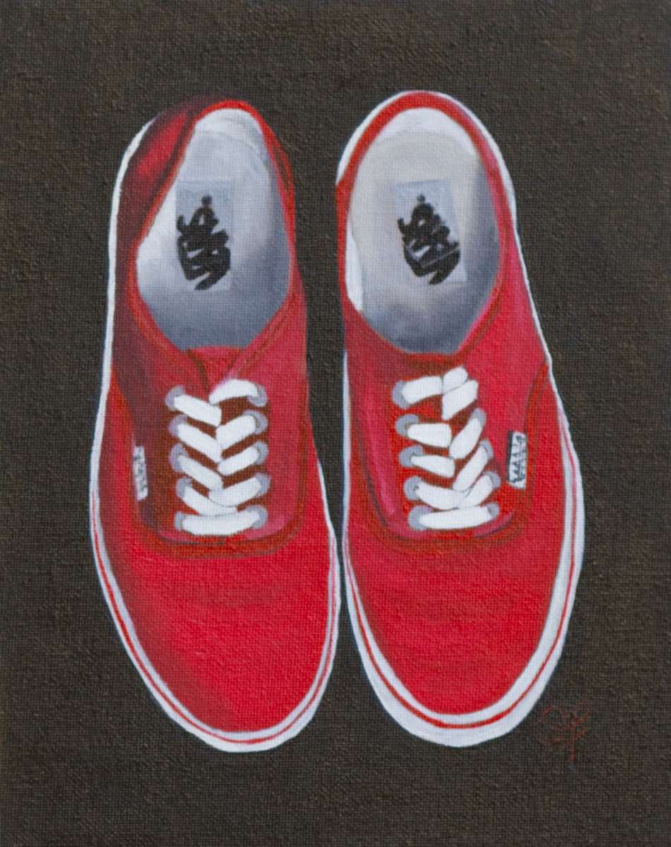 Lois is a heartfelt reflection of vibrant colors and cherished memories. Inspired by a pair of bold red Vans with purple accents this piece captures the essence of a moment filled with laughter connection and the simple joys of life. The story behind the painting unfolds at a quiet pond where a misstep into the water led to the bittersweet farewell of these beloved shoes. Despite their loss the memory remains vivid—a symbol of carefree days and the bond shared with family.