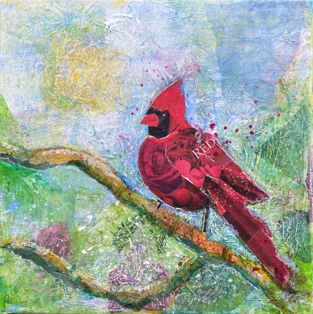 Red male cardinal on a branch. Ink pastels paper collage watercolor and acrylic on canvas.
