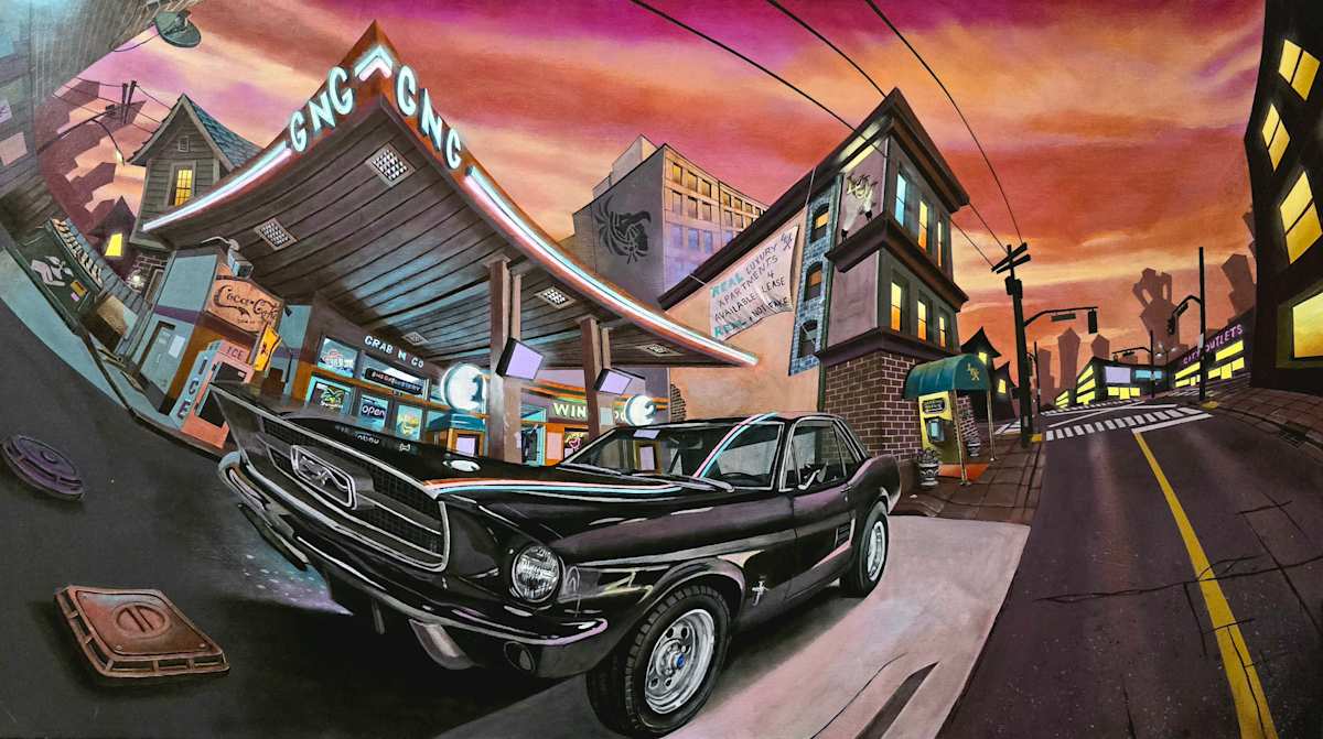 Foreground: A shiny black classic Mustang (likely a late 1960s model) dominates the foreground. It's parked confidently on the edge of the sidewalk, angled toward the viewer with its front bumper practically bursting into our space. The exaggerated perspective lines and reflections on the vehicle make it feel bold and important, possibly symbolic of escape, status, or a pivotal character’s identity.