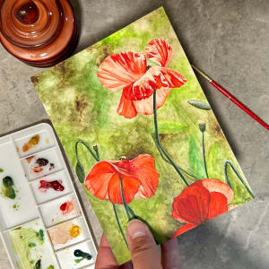5x7” pyrography watercolor painting of poppies on 140# cold press paper.