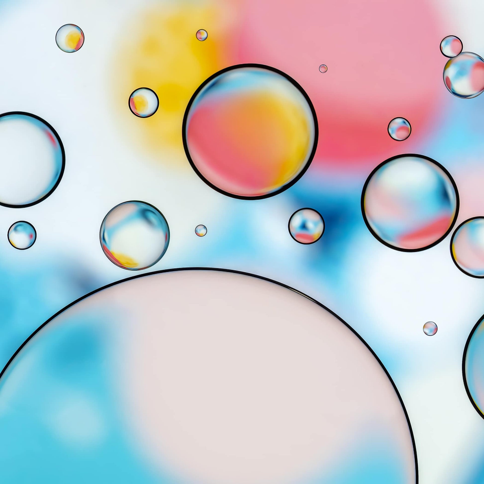 Stroll into the cheerful world of "Summer Whimsy" a piece that perfectly captures the lighthearted joy of sunny summer days. Inspired by clear blue skies fluffy white clouds and blooming pink flowers basking in the warm glow this abstract style macro photograph of oil and water brings all the feel-good vibes of the season into one vibrant design.