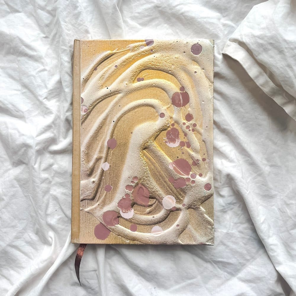 This richly textured hand painted blank unlined journal is perfect for collecting your inspired moments. Original hand painted journal with blank unlined paper. This journal features a textured painting on the front cover ribbon bookmark and branding with signature by the artist on the back cover. Size: A5/8.3”x5.7”. 200 pages. 80gsm thick paper. Perfect for sketching writing journaling scrapbooking or anything your heart can imagine.