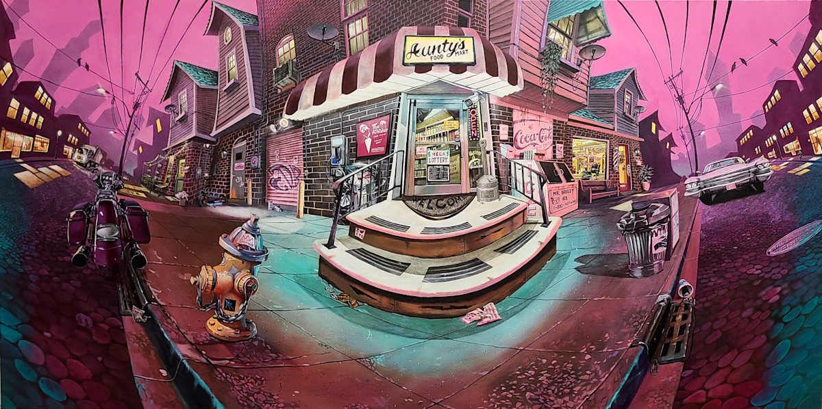 "The Corner" immerses the viewer in a vivid nostalgic and surreal urban neighborhood within the town of Braxton. The scene is centered around a local corner store called "Aunty's Food Mart", where the local kids like to congregate over a soda after a hard game of basketball at the park. The visual esthetics blend the familiarity of spoof product placement, vibrant color schemes, immersive details, and exaggerated view perspectives.