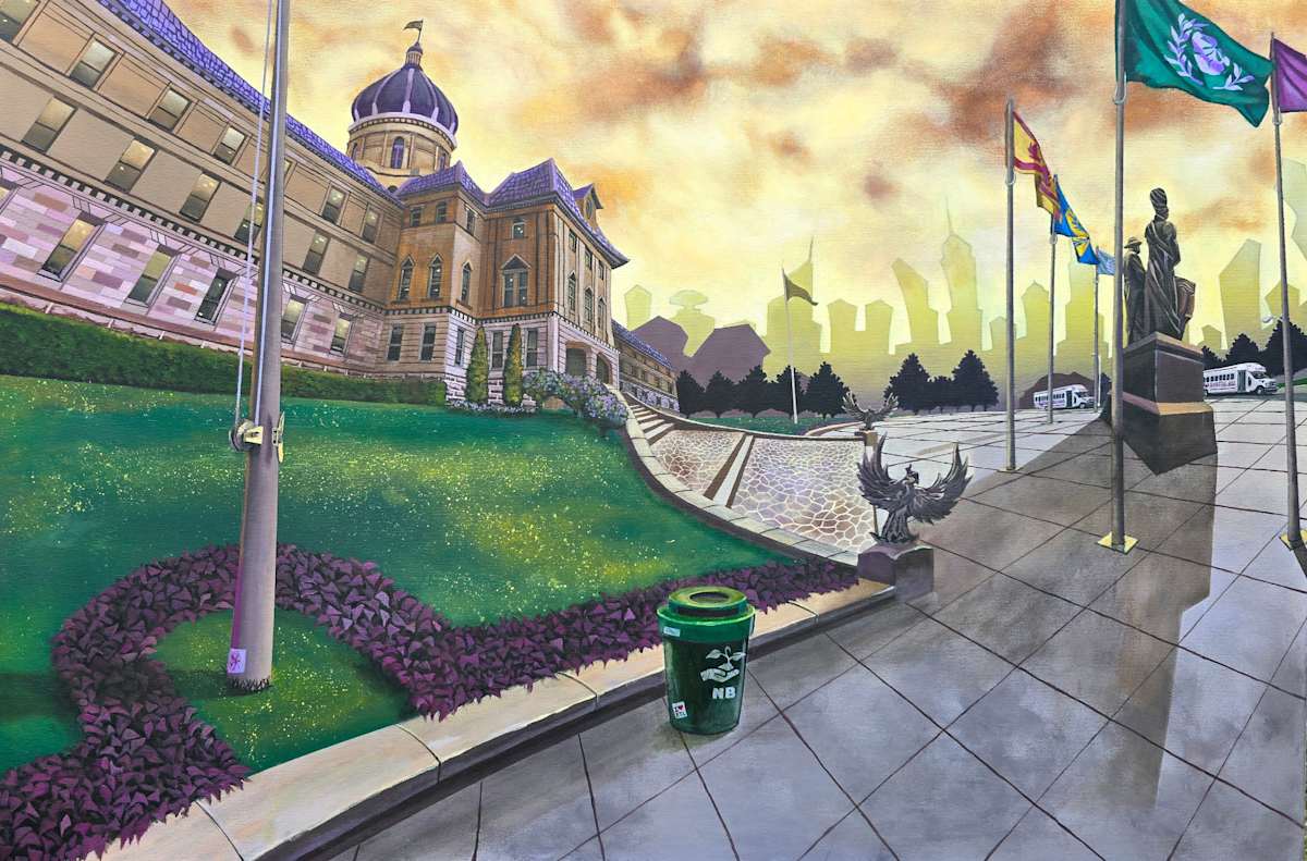 This painting blends realism with stylized elements to convey a symbolic and civic scene.