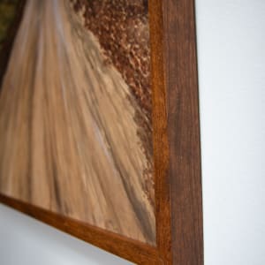 Handcrafted Cherry Hardwood Frame (1.5" depth) The Way is a scenic landscape painting that incorporates pyrography and watercolor to compliment the wood grain of the panel. This piece has texture and movement that flows through the piece to draw you into the light. The brushstrokes convey a sense of rushing movement while the trees ground you in a calm sense of peace all at the same time. The landscape is inspired by a back road called the “Old Grade” in Whipholt MN. The quiet beauty of being among the trees in this area is incredible. One of my favorite memories from up north is riding down these back roads with the four-wheeler and taking moments to stop and appreciate the nature that surrounds us.